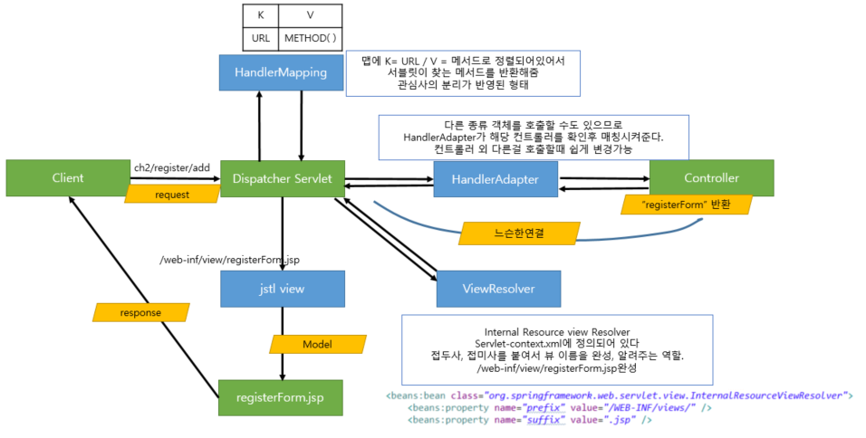 | ViewResolver | 문자열 기반의 논리적 뷰이름을 실제 뷰로 변환해줍니다. |