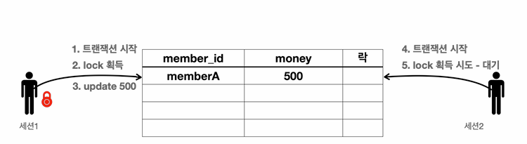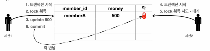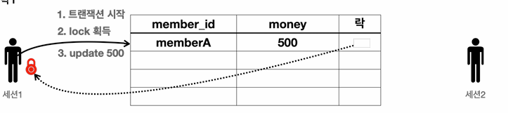 2. 세션1은 memberA의 money를 5000으로 변경을 시도할떄 해당 로우의 락을 획득한다.
