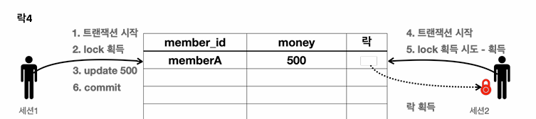 2. 세션2도 해당 로우의 데이터 변경을 시도하려 하지만, 해당 로우는 이미 세션1이 갖고있기떄문에 락이 돌아올떄까지 대기해야한다. (락은 무한정 대기하는것이 아닌 락 대기 시간을 넘으면 락 타임아웃 오류가 발생)