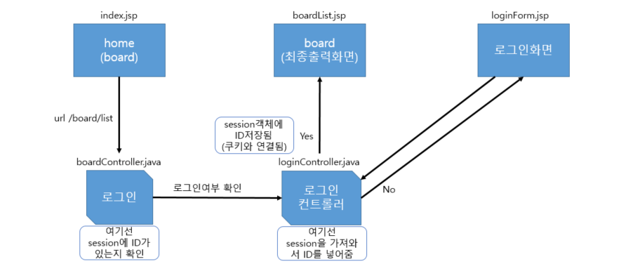 클라이언트가 board/list를 요청을 하면 세션을 통해 로그인 체크여부를 확인한다 -> session.getAttribute() 세션에 저장된 값이 있는지 없는지 확인하고 없으면 -> reidrect:/login/lgon/ 로그인 화면으로 리다이렉트 하도록 만들었다.