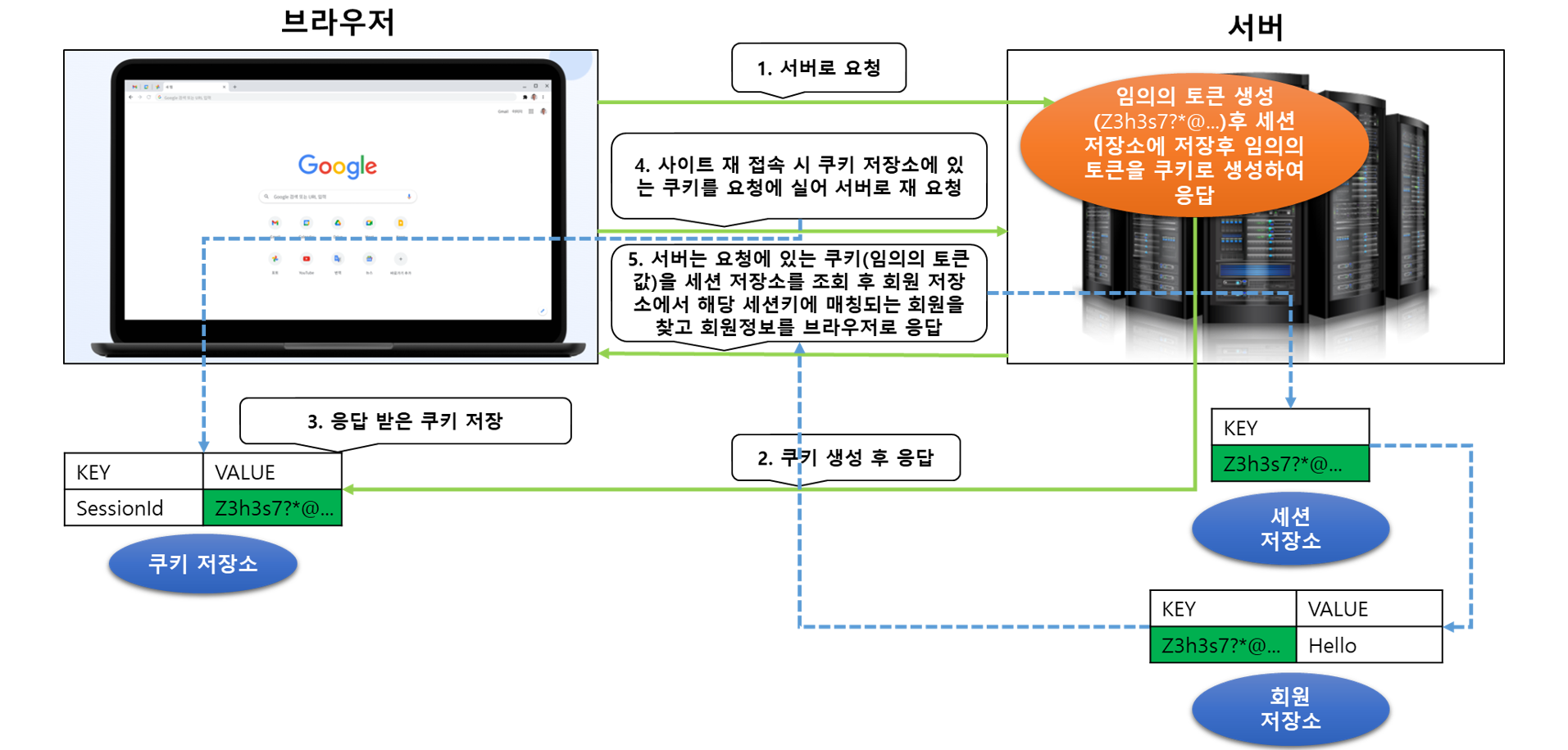 1. 세션을 사용하는 사이트에 접속하면 서버에서는 사용자를 구분하기 위한 기한의 짦은 임시키, 즉 세션 키를 브라우저에 보내서 쿠키로 저장한다.