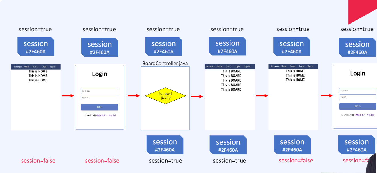 3.브라우저가 이 사이트의 페이지들에 접속할떄 마다 http 요청에 이 세션 키를 실어서 전송하고, 서버는 그 세션 키를 보고 "애는 얄코구나"를 인식해서 얄코의 정보들을 가공해서 응답을 보내준다.