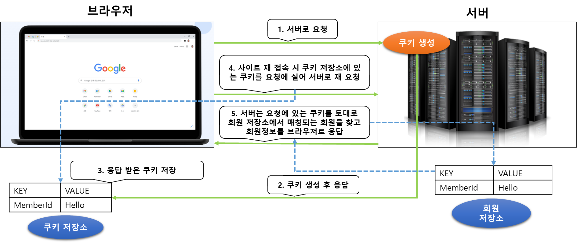 쿠키란 비유하자면 => 찜질방 손목열쇠. 시설을 이용할떄마다 보여줘야된다.